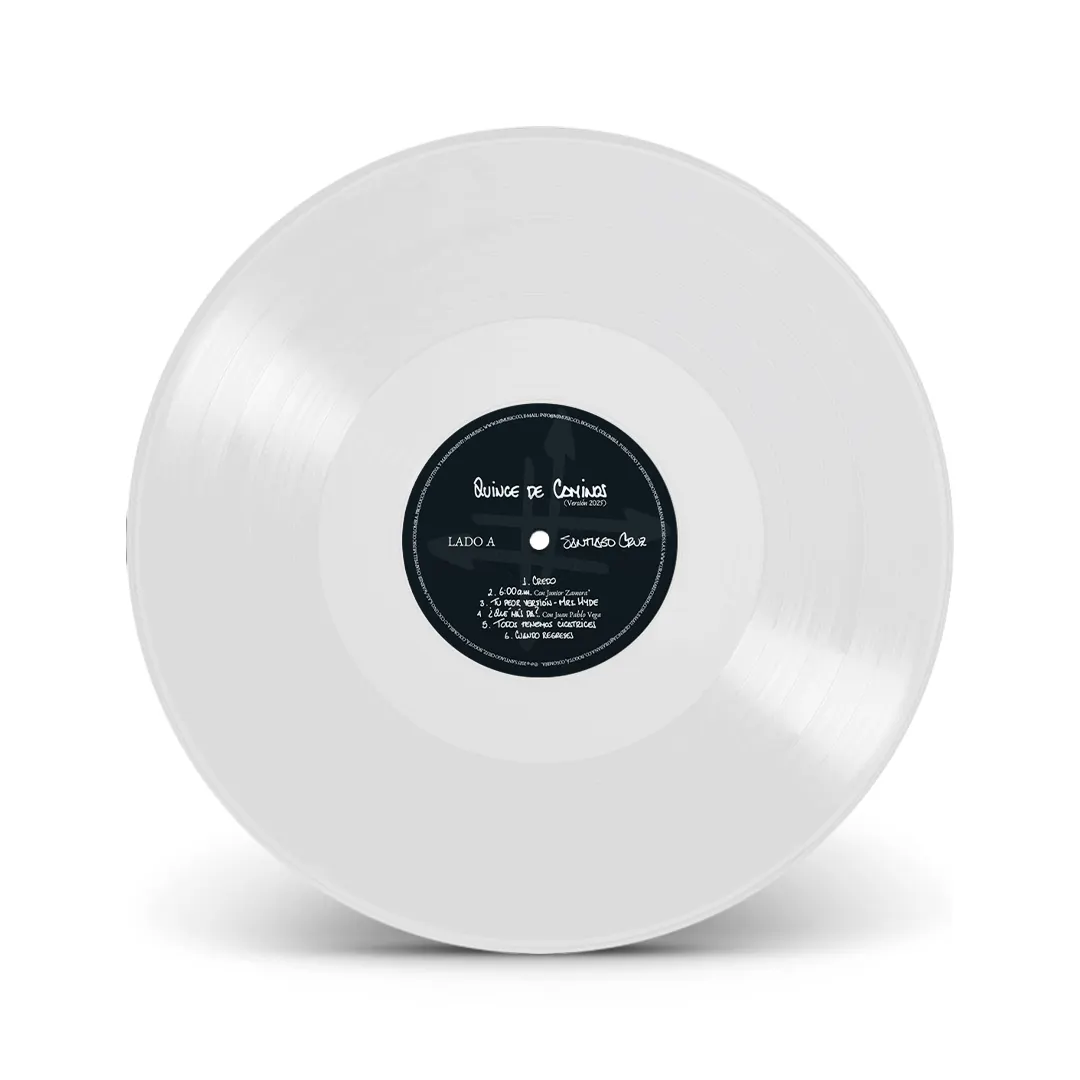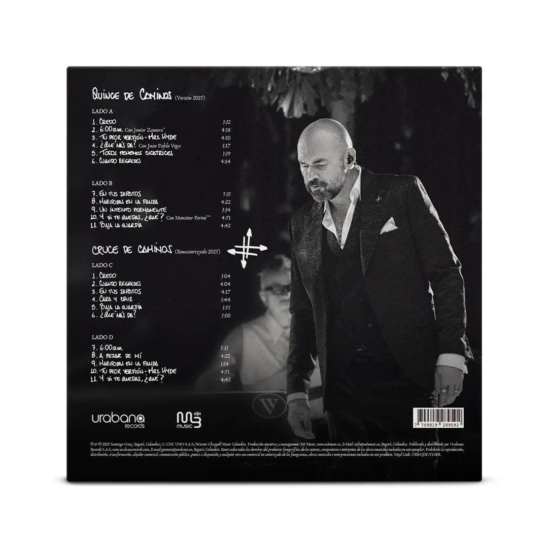 “Quince de Caminos” es la edición especial en vinilo doble con la que Santiago Cruz celebra los 15 años de Cruce de Caminos, el álbum que marcó un hito en su carrera y en el pop colombiano. En esta ocasión con una grabación en vivo, este lanzamiento revive sus canciones más queridas con una energía renovada y la complicidad de una audiencia íntima, acompañado por músicos de gran trayectoria como Monsieur Periné, Juan Pablo Vega, Juan Galeano, Daniel Álvarez (Diamante Eléctrico) y Daniel Duplat, además de las versiones originales remasterizadas 2025. Este vinilo es una pieza de colección imprescindible para fans y amantes de la música latina.